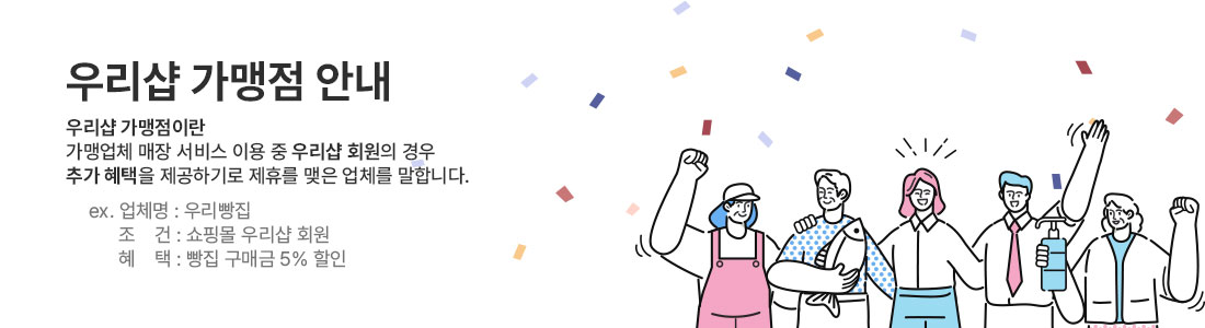 (주)더우리샵의 사전 서면 동의 없이 우리샵의 일체의 정보, 콘텐츠 및 UI 등을 상업적 목적으로 전시/전송/스크래핑 등 무단 사용할 수 없습니다.